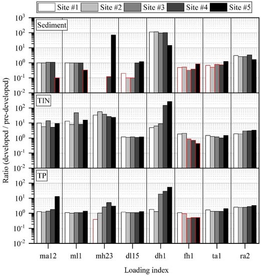 Ratios between observed developed and simulated pre-development loading indices at five gauging sites in Hinkson Creek, Missouri, USA. Ratios less than 1 (i.e., observed < simulated) are outlined in red. Definitions of indices are provided in Table 5. Total inorganic nitrogen is TIN, and total phosphorus is TP.