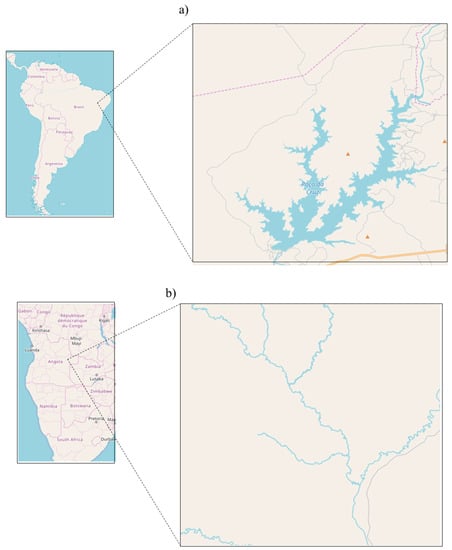 The OSM project became a rapidly growing crowdsourced mapping initiative [] that has attracted a significant research attention []. The data is created by volunteers, which have very different levels of experience and skills in the domain of geographical information. Even though OSM contains approaches to control the quality of the collected data, there are always errors in the data, which may be of several types, e.g., [,,]. Therefore, several aspects related to the quality of OSM data have been studied in different regions of the world. For example, in some regions (mainly central Europe and some regions of North America) OSM is a rich source of data, containing, in some cases, data that is not available in official datasets. However, there are sometimes inconsistencies, as well as heterogeneity of data regarding, for example, data completeness and positional quality, e.g., [,,,]. Nevertheless, one of the features that the volunteers introduce first in OSM are water bodies, such as rivers, and lakes, as these are important terrain features. Figure 1 illustrates this aspect with two examples, one in Brazil–South America (Figure 1a), and the other in Angola–Africa (Figure 1b), where it can be seen that very few data is available besides water features.