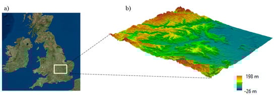 The study was applied to a rectangular region with 13,899 km2, located in the United Kingdom, with a maximum and minimum elevation of 198 m and −26 m, respectively. The region is characterized by zones with different characteristics in terms of relief. Figure 2 shows the location of the study area and a 3D visualization of SRTM 30 for that region.