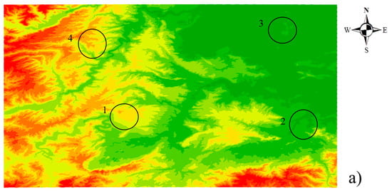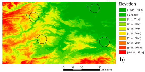 A reference DEM was downloaded from the Ordnance Survey web page [], which is the National British Mapping Agency of United Kingdom, also in grid format, with a spatial resolution of 50 m and the vertical datum Newlyn 1915. This DEM was used as a reference because, even though it has lower spatial resolution than SRTM 30: (1) it was obtained with photogrammetric approaches using large-scale aerial imagery; and (2) according to information available from the Ordnance Survey web page, it has a root mean square error (RMSE) of 4 m, computed using ground reference points, which is higher than the RMSE of SRTM 30, which was proven to be around 10 m, e.g., [,,]. Figure 3 shows the reference DEM and SRTM 30 for the study area. A closer analysis of Figure 3 enables the identification of some differences in both DEMs, for example, in the regions numbered from 1 to 4 identified by the black circles.
