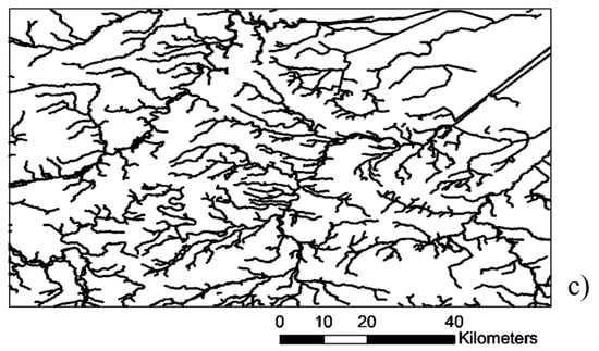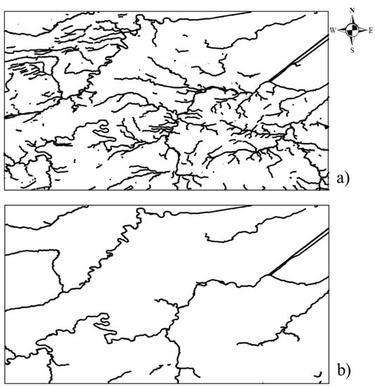 The OSM data was downloaded in shapefile format from Geofabrick on 8 September 2015. The downloaded OSM data contained all features available for the study area. From these, the features corresponding to the key “waterways” and values “rivers” and “streams” were selected, which correspond to natural water courses. Features with other values, such as “canal” or “ditch” were not considered. Figure 4a shows the OSM watercourses corresponding to the keys “rivers” and “streams” and Figure 4b shows only the rivers. It can be seen that the drainage network shown in Figure 4a presents many incomplete discontinuous branches, while the rivers (Figure 4b) are, in most cases, represented by continuous lines.