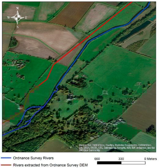 The reference drainage network of the study area, shown in Figure 4c, was downloaded from the Ordnance Survey []. This network is formed by 144,000 km of watercourses. These data are in ESRI shapefile format, at scales ranging from 1/15,000 to 1/30,000. The option of using the drainage network available from the Ordnance Survey web page as reference data instead of the one extracted from the reference DEM is justified due to the influence that the spatial resolution of the reference DEM (50 m) has over the accurate horizontal position of the drainage network, as can be seen in Figure 5, which shows a detail of the network extracted from the DEM and the network available in the Ordnance Survey website over a satellite image, showing that the position of the second one is more accurate.