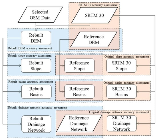 Flowchart of the processes to obtain the accuracy of SRTM 30 and the rebuilt DEM, as well as the accuracy of the drainage network, slopes, and basin delineation extracted from the original SRTM 30 and the DEM rebuilt using OSM data.