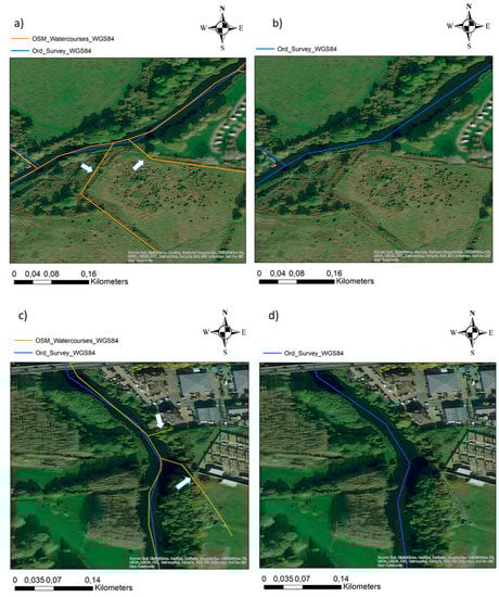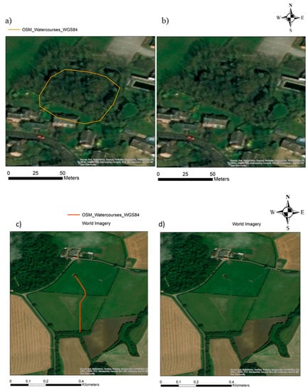 Figure 8 shows additional examples of incorrect OSM waterways that, in this case, are isolated from the drainage network and are not natural water courses.