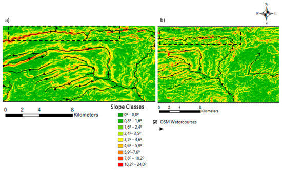 The other aspect that needs to be checked for this application is the orientation of the water lines extracted from OSM, as the ANUDEM interpolation method implemented in ArcGIS software (ESRI, Redlands, CA, USA), which is used to create the new DEM, requires the waterlines to be oriented from upstream to downstream. As this type of restriction does not exist in the protocols used for OSM data collection, the orientation of all waterways used to create the new DEM needs to be checked and, if necessary, inverted. This can be easily done in ArcGIS (ESRI, Redlands, CA, USA), as the orientation of each linear segment can be made visible by selecting a symbology that shows the segments’ orientation (see Figure 9), and inverted using the “Flip” tool available in the “Editor” toolbar. If wrongly-oriented lines are used to create a new DEM, they generate regions with erroneous morphology and elevation. Figure 9a shows a part of a waterline with wrong orientation overlaid with the slope derived from the DEM created with those OSM waterlines (rivers and streams), showing a large slope variation in the region around the waterline. Figure 9b shows the same when the slope is derived from the rebuilt DEM built with properly-oriented waterways, where this problem does not occur.