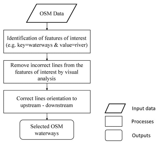 Another type of geospatial information freely available for the entire world is the data collected in the collaborative project OpenStreetMap (OSM). The volunteer citizens may create vector data, using a diversity of available feature types, such as rivers, streets, buildings or points of interest, which are represented by points, lines and relations. A list of the features proposed by OSM is available in []. OSM data are structured by tags, containing a key and a value. The features that represent watercourses are used in this study, and are characterized by the key “waterway”, which may take several values, such as “rivers”, “streams”, or “riverbank”.