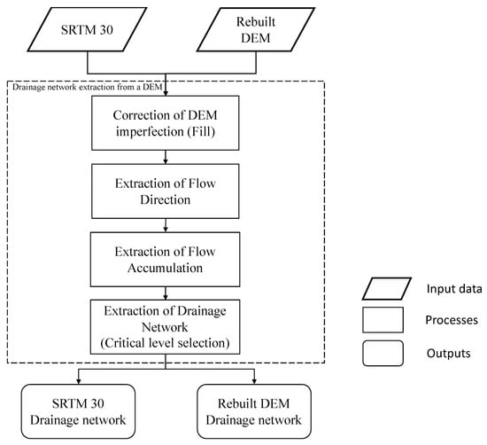 Flowchart of the drainage networks extraction process from SRTM 30 and the rebuilt DEM.