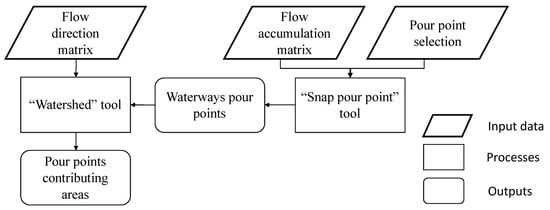 The basins of the study area were generated from the reference DEM and the DEMs under analysis. Contributing upstream areas for the chosen pour points can be generated using the tool “watershed”. Figure 13 illustrates the process for their creation, by using the flow direction matrix and a set of chosen pour points that need to be positioned at the water courses, which is achieved by using the tool “Snap pour point” and the flow accumulation matrix.