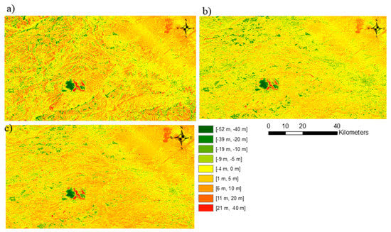 Figure 16 shows the spatial distribution of those differences for the original SRTM (a), the rebuilt DEM using rivers and streams (b), and the rebuilt DEM using only the rivers (c). It can be seen that there are more pixels in (a) and (c) in red, corresponding to positive differences between the reference DEM and the rebuilt DEM, with values in the interval 21 m to 40 m, while in (b) there are more regions in yellow and light orange (corresponding to differences close to zero) and much fewer regions in red. The regions with negative differences (shown in green) correspond to the regions where the rebuilt DEMs are higher than the reference DEM, and these regions are kept more or less unchanged. A closer analysis shows that these regions are located in the more elevated areas, where the drainage network used to rebuild the SRTM has less influence.