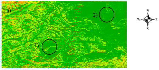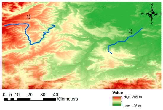 A more detailed analysis of the changes obtained with the rebuilt DEMs was made for two river sections in the study area, located in regions with different types of relief. Figure 22 shows the location of the analysed rivers sections. The one indicated as (1) is located in a region with higher altitude and steepest slopes, and river section (2) is located in a relatively flat region.