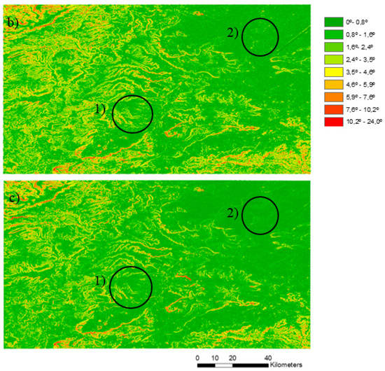 Slope of the study area derived from: (a) the Ordnance Survey reference DEM, (b) the original SRTM 30, and (c) rebuilt DEM using rivers and streams. The black circles 1) and 2) highlight regions where differences between maps can be observed.