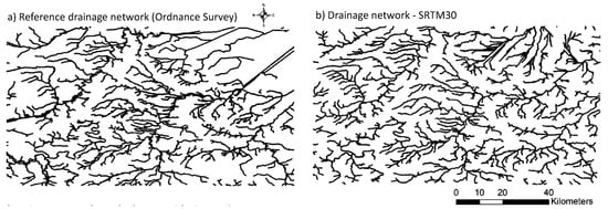 The datasets used in the present study are: (1) the SRTM 30 DEM for the study area; (2) the waterways extracted from OSM, corresponding to the key “waterway” and values “rivers” and “streams”; and (3) the drainage network of Great Britain and a DEM, with a spatial resolution of 50 m, both datasets available in Ordnance Survey web page, used as reference data.