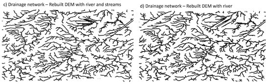 (a,c) show isolated OSM watercourses that were removed from the drainage network used to create the rebuilt DEM; and (b,d) show the image without these watercourses.