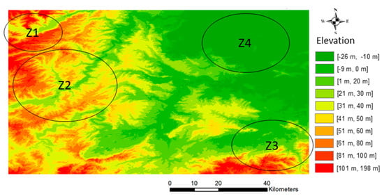 In addition to the analysis of the positional accuracy of the drainage network in the entire study area, an analysis was made for zones with different relief characteristics. Four zones were selected as indicated in Figure 19, referred to by Z1, Z2, Z3, and Z4. Zone Z1 corresponds to the region with higher elevation, zones Z2 and Z3 correspond to transition zones to flat regions, and zone Z4 corresponds to a flat zone.