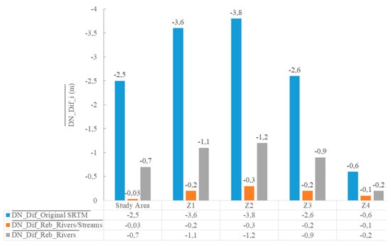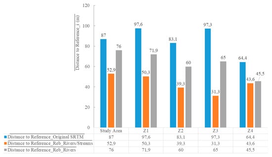Figure 21 shows a graph where the mean of the vertical differences between the reference drainage network and the drainage networks extracted from the original SRTM 30 and the rebuilt DEMs using OSM rivers and streams and only OSM rivers is represented for the complete study area and for zones Z1, Z2, Z3, and Z4.