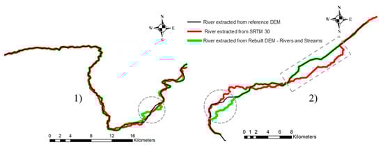 Observing Figure 23 it can be seen that in most regions the rivers sections extracted from the rebuilt DEM are coincident with the reference data, except in the regions highlighted with dashed circles. Additionally, for river section (2) the rebuilt DEM enabled correcting the position of a large section of the river when compared to its location extracted from SRTM 30, highlighted with a dashed rectangle, where the horizontal distance between the lines originally reached approximately 1700 m.