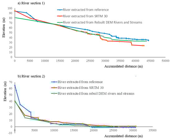 Figure 24 shows the profiles of the river sections indicated in Figure 22 and Figure 23. It can be seen that, in both cases, the drainage network obtained from the rebuilt DEM is, in general, closer to the reference data. The only exception is in the beginning of river section (1) (between 0 m and 5000 m of accumulated distance), where the vertical difference between the reference and the rebuilt line take values near 14 m. It can also be observed that, in this river section, the lower differences take place between the accumulated distances of 7000 m and 16,000 m for the SRTM 30 and rebuilt lines. For river section (2) the largest vertical difference between the reference and the rebuilt line occurs at the beginning of the river section with a value near 25 m. It can also be seen that the major differences of elevation between the reference and the drainage networks extracted from SRTM 30 and the rebuilt DEM occur until 4000 m of accumulated distance, corresponding to the region with a major variation in elevation. In the remaining part of this river section, corresponding to the regions of lowest altitude, both lines showed an increasing approximation to the reference.