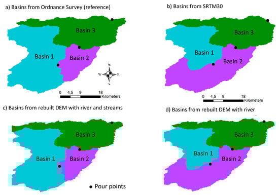 Basins generated for the indicated pour points from: (a) the reference DEM, (b) the original SRTM 30, (c) the rebuilt DEM with OSM rivers and streams, and (d) the rebuilt DEM with OSM rivers.