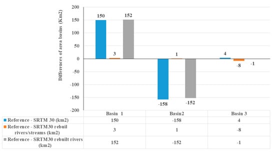 Figure 26 shows the area differences between the basins obtained from the reference DEM and the ones obtained from SRTM and the rebuilt DEMs. It can also be seen that the areas of the basins obtained from the rebuilt DEM with OSM rivers and streams are very similar to the ones obtained from the reference DEM, with a larger difference for Basin 3 (−8 km2), due to the extra region identified at the top left of the study area (Figure 26a,c).