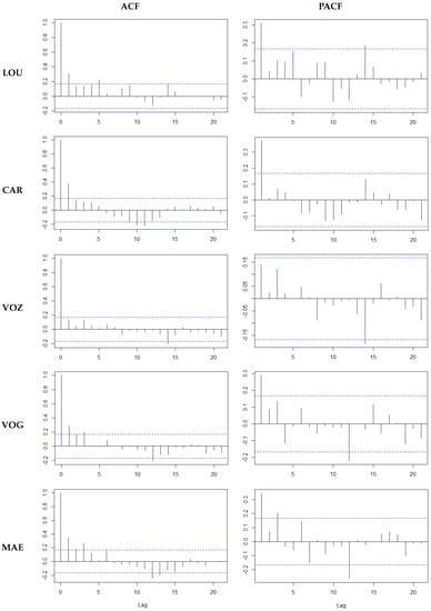 For each location, the estimates of the coefficients and the respective p-values, as well as the determinant coefficient values, , are presented. The data indicate a good fit for all five models. Moreover, for all series, the residual series of the adjusted model MI presents a weak time correlation. In fact, if the linear model fits well to data, the residual series has white noise behavior, that is, both the sample autocorrelation function (ACF) and the sample partial autocorrelation function (PACF) have values statistically insignificant at a 5% level. The time correlation structure can be generally described by an autoregressive processes of order 1, AR(1), as can be seen from the analysis of the ACF and the PACF displayed in Figure 2, due to the ACF decreasing exponentially to zero, while the PACF has a significant value on lag 1. So, in order to assess the statistically significant parameters, the corrected p-values are also presented in Table 3, as well as the AR(1) parameter estimates considered in the p-values correction.