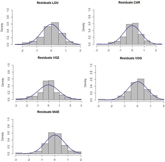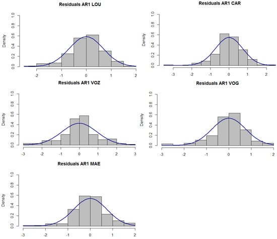 For the model MII (2)–(3), the residuals of the models did not present a significant time correlation; their histograms, after applying the Lunj-Box test with different lags, can be seen in Figure 3. The graphs do not seem to be far from the normal curve and, with the exception of the CAR monitoring site, they do not reject the normality assumption at the 1% significance level through the Kolmogorov–Smirnov test (K–S). This test is usually applied when the series dimension is large. The Jarque–Bera test, which compares the empirical skewness and kurtosis with the correspondent Gaussian values, was also applied, and the results pointed in the same direction: residuals normality was not rejected.