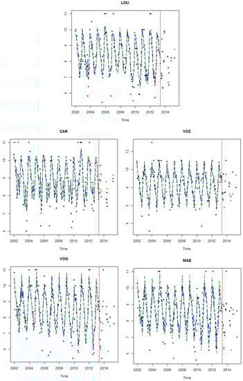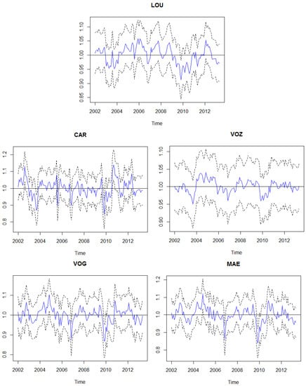 From the analysis of the estimation results, for each monitoring site, the estimates of all intercepts are statistically significant, considering a significance level of 10%. For monthly slopes, at least one parameter estimate is statistically significant for each monitoring site model. In the LOU station series, significant slope parameters are associated with June and September. In the CAR monitoring site is a significant slope parameter for May, while, in VOZ, it is the November slope parameter. In the VOG site model case, the significant slope parameters are associated with July, August, and November, and in the model of station MAE, only the August slope parameter is statistically significant. Note that all significant slope estimates are negative, indicating that, during those months, DO concentration was decreasing.