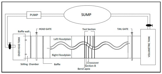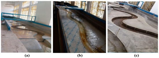 The bed slope of the channel is recorded as 0.001 for all the three types of channel. A movable bridge is placed across the flume with the facility of traversing on both the directions over the flume for taking measurements at different locations in the channel section. A measuring tank is situated at the downstream end of the flume. Water from the measuring tank is collected in a sump, which again feedbacks to the overhead tank with the help of a centrifugal pump. A closure valve is fitted at the downstream volumetric tank. A schematic illustration of the experimental setup of the compound meandering channel is shown in Figure 4. For a better understanding of the experimental channel setup, the sample photograph of NITR Type I, Type II, and Type III meandering compound channels are shown in Figure 5.