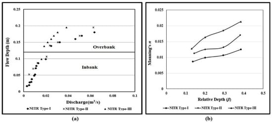 The relationship of (a) Stage-discharge for experimental channels; and (b) Manning’s with relative depth.