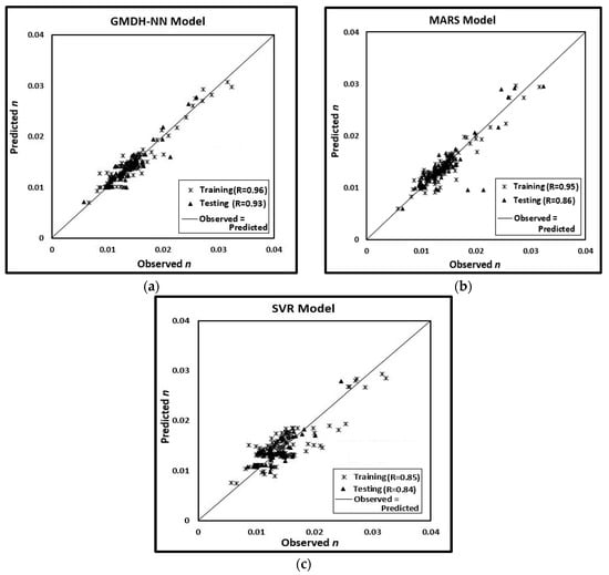 The Scatter Plots show the Regression Coefficient and the 1:1 Perfect Fit Line between the Observed and Predicted Manning’s for (a) Group Method of Data Handling Neural Network GMDH-NN) Model; (b) MARS Model; and (c) support vector machine regression (SVR) Model.