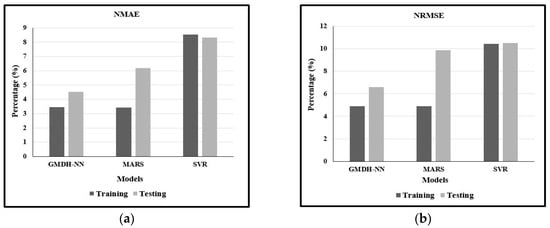 Performance of Training and Testing Data Samples for Prediction of by (a) normalized value of mean absolute error (NMAE); and (b) root mean square error (NRMSE).