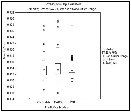 A box and whisker plot, which is used for graphically representing groups of numerical data through their quartiles is shown in Figure 10. In the boxplot, the lower and the upper ends lie at the lower quartile (25th percentile of the dataset ) and the upper quartile (75th percentile of the dataset ), respectively. Inside the boxplot, the 50th percentile of the dataset is the median value of the predicted Manning’s . The whisker is the two horizontal lines extended from the uppermost (top) and lowermost (bottom) of the box, whereby the lowermost whisker prolongs from to the minimum non-outlier, which is the poorest expected Manning’s value in the predicted data. The top whisker tracks from to the largest non-outlier. Based on graphical representation, the distribution statistics of the lower quartile , median , upper quartile Manning’s , mean , standard deviation , range , skewness, and kurtosis are given in Table 5. Here, denotes the predicted value of Manning’s . It is noticed that all of the quartile values obtained seems to be in almost similar range in three models for the predicted . These results are verified with the corresponding values of the distribution statistics, as shown in Table 5. The GMDH-NN model reveals the greatest degree of the range of predicted , which is also justified by the extended bottom-end of the whisker plot, as in Figure 10.
