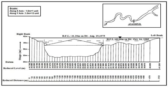 Cross-section of Baitarani River at the gaging site (Anandapur, Odisha, India) [].