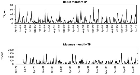 The locations of the six gauging stations used in this study are shown in Figure 1. Data from the United States Geological Survey (USGS) 04208000 in Cuyahoga River at Independence, USGS 04212100 in Grand River near Painesville, USGS 4193500 in Maumee River at Waterville, USGS 04176500 in Raisin River at Monroe, USGS 04198000 in Sandusky River near Fremont, and USGS 04199500 in Vermilion River near Vermilion were used. The monthly time series of TP are shown in Figure 2. Typically, USGS stations have long-term streamflow data. However, for phosphorus, some of the stations (e.g., Maumee) have long-term data since 1974 and some stations have only seven to eight years’ worth of data (e.g., Vermilion). The average daily P loads were used in the wavelet analysis. There were only very few occasional missing records, which were observed for one day or for a short time-period. Since continuous data are needed for wavelet analysis, the LOADEST method was used to fill the data gaps. LOADEST fills missing values by using fits for the regression relationship between the response variable (TP load or SRP) and predictor (streamflow).