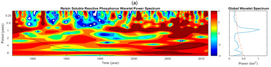 The CWT spectrum of P indicated that the variability in TP was influenced by periodicities ranging from 3 months to 1 year, but it is limited to short-term fluctuations that persisted only from 2006 to 2007 (Figure 12a). No significant variance that could explain the overall variability was detected in the GWPS. The CWT spectrum of TP also indicated that there were no dominant annual patterns present in TP. However, short-term fluctuations of SRP loading persisted for a few years with a large, noisy signal apparent from 2002 to 2004 (Figure 12b). The time-averaged spectrum depicted that the 1-year periodicity explained most of the overall SRP variability in this watershed. Since the available data were short for this river, the DWT analysis was not performed. As a result, in this study, the Vermilion watershed provides limited information on Lake Erie’s P loading variability.