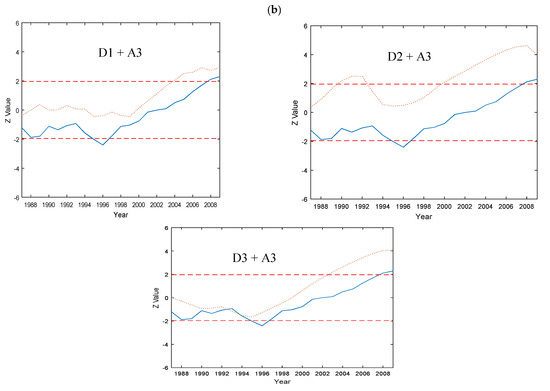Raisin River: (a) Wavelet power spectrum of daily Streamflow. (b) Plots of the sequential Mann–Kendall analyses on the Details (with added Approximation component) of the annual streamflow data. The top and bottom dashed lines are ±1.96, which are the confidence limits of the MK test using α = 5%. The solid and dotted lines show the sequential MK values for the original data and the Detail components, respectively. For this streamflow data, the D3 (8 years) component was the most dominant periodicity for trend.