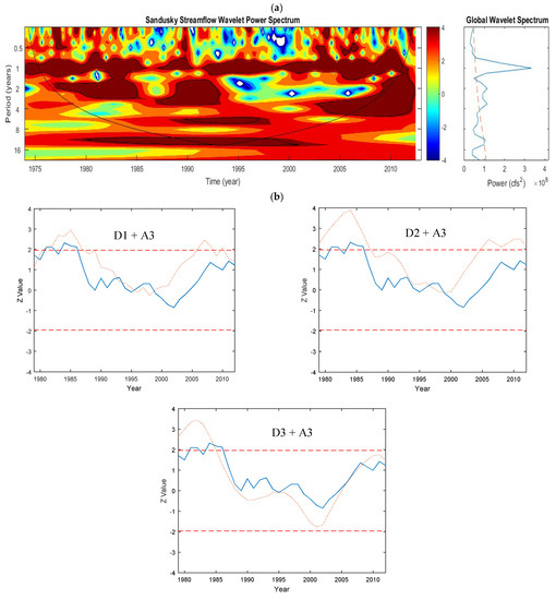 Sandusky River: (a) Continuous wavelet transform of the daily streamflow. (b) Plots of the sequential Mann–Kendall analyses on the Details (with added Approximation component) of the annual streamflow data. The top and bottom dashed lines are ±1.96, which are the confidence limits of the MK test using α = 5%. The solid and dotted lines show the sequential MK values for the original data and the Detail components, respectively. For this streamflow data, the D1 (2 years) and D3 (8 years) components were the most dominant periodicity for this trend.