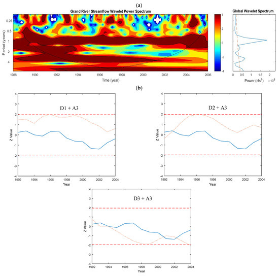 Grand River: (a) Continuous wavelet transform of daily streamflow. (b) Plots of the sequential Mann–Kendall analyses on the Details (with added Approximation component) of the annual streamflow data. The top and bottom dashed lines are ±1.96, which are the confidence limits of the MK test using α = 5%. The solid and dotted lines show the sequential MK values for the original data and the Detail components, respectively. For this streamflow data, the D1 (2 years) and D2 (4 years) components were the most dominant periodicity for this trend.