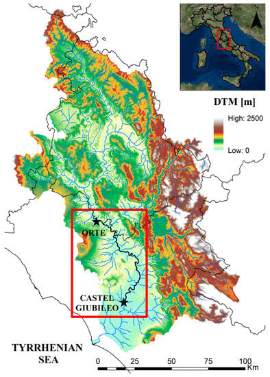 2. The floodplain domain is located in the downstream portion of the catchment, south of the Umbria–Lazio regional boundary. The inundation domain goes along the river channel for about 120 km between Orte (12°23′39.52″ E, 42°27′27.08″ N) and Castel Giubileo (12°29′59.34″ E; 41°59′40.29″ N), just upstream of the city of Rome, before the river flows out into the Tyrrhenian Sea (