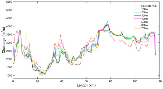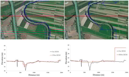 Figure 6. Here, the impact of the resolution on simulated floodplain flow dynamics is evident, considering that the expected impact of the different floodplain DTM realizations on the flood wave attenuation process. The use of synthetic cross section provides notable differences as well as the approximation of the channel bank elevation that plays here a major role, considering the importance of accurate river–floodplain exchange simulations. This result shows the significant impact of the resampling procedure on the simulation of flood wave propagation dynamics (i.e., discharge, velocities).