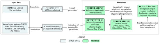 The presented methods are integrated to develop a floodplain terrain and fluvial bathymetry processing procedure that is implemented to produce a very coarse resolution (up to 700 m) flood model. The procedure aimed to test the effect of channel and floodplain topography upscaling on simulated inundation extent and dynamics comparing coarse resolution flood models with a reference higher resolution 2D hydraulic model. The original inundation model, at 150 m resolution, was used as reference case considering it was previously calibrated and validated and included surveyed natural cross sections to represent channel bathymetry. The presented tests evaluated, firstly, the possibility of replicating the reference model results at the same resolution (150 m), but substituting natural cross sections with synthetic rectangular cross section calibrated using information related to flow area and thalweg profile. Then, the upscaling of the 2D floodplain terrain model was performed producing coarser resolution inundation models (from 200 m to 700 m) evaluating differences in the hydraulic modeling results.