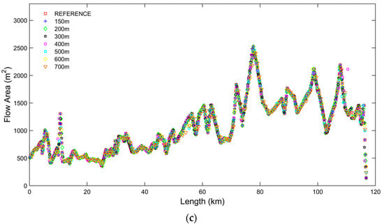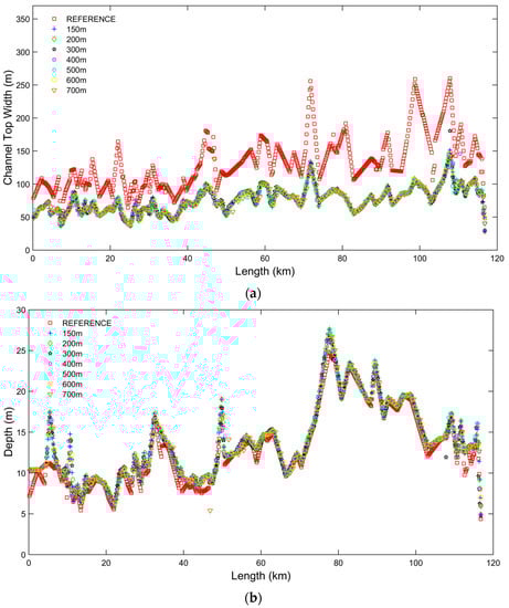 Figure 4 presents the results of Steps (i) and (ii) of the procedure by showing the cross section width, depth and flow area associated to interpolated synthetic rectangular cross sections at varying resolution with respect to surveyed cross sections of the reference model. It is shown how the channel bed elevation and flow area are preserved in all models for adjusted channel top width.