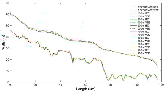 Figure 5. The visual comparison shows that the six upscaled models have a consistent Water Surface Elevation (WSE) with discrepancies increasing with decreasing resolution. It is noted that the simulated surface seems always consistent even in some segments of the river reach where the spatial adjustment determines notable differences in the location of the bed profile. An underestimation of the water surface elevation is also noted when the channel slope is steep, while in the flat downstream valleys the differences decrease.
