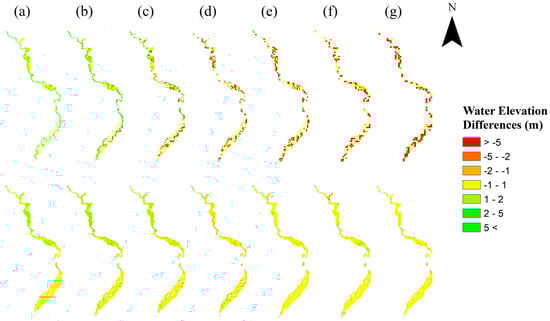 Figure 8 presents the spatial distribution of differences between floodplain maximum flow levels of the reference model compared to the upscaled flood simulation at different resolutions.