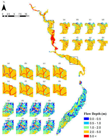Figure 9 shows the results of the simulated maximum flow depths from the reference 2D hydraulic model simulation for the entire study domain. Three insets are inserted into