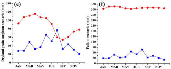 Simulated monthly soil water content of the whole soil profile under dryland (a) winter wheat, (b) cotton, (c) soybean, (d) sunflower, (e) grain sorghum, and (f) fallow land use scenarios.