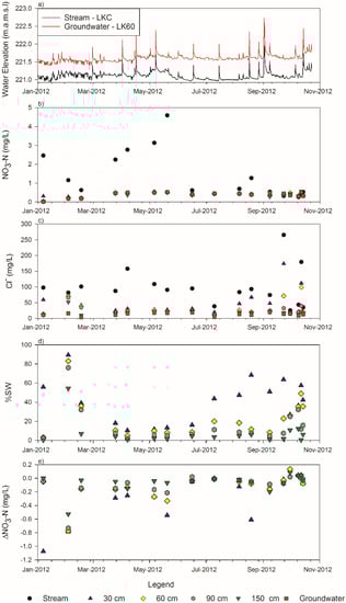 The distribution of the Cl− concentrations among the stream, the multi-level samplers, and the groundwater allowed the mixing model, Equations (1)–(3), to be used to determine the composition of the waters at a given depth (%SW) and to calculate the ΔNO3-N, assuming no loss or removal of NO3-N from the system. Downwelling of stream water was evident at all depths during the period of study (Figure 3d and Table 2). The 30-cm depth comprised the highest percentage of stream water, with a mean %SW of 41%, while at 150 cm the %SW was typically less than 10%. From April to July, the streambed waters exhibited the least amount of stream water across all depths, with the 30-cm depth exhibiting %SW from 10% to 18%; in the deeper waters, the %SW were all below 10%. Beginning in July, the percentage of stream water at the 30-cm depth rose; increases in the %SW ratios at the greater depths were observed to begin in September.