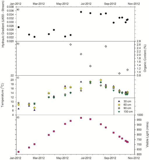(a) Hydraulic gradient between LK 60 and the stream; (b) organic content within the top 25 cm of the streambed; (c) temperature measured within the hyporheic zone at the specified depth; (d) visible light measured during the day.