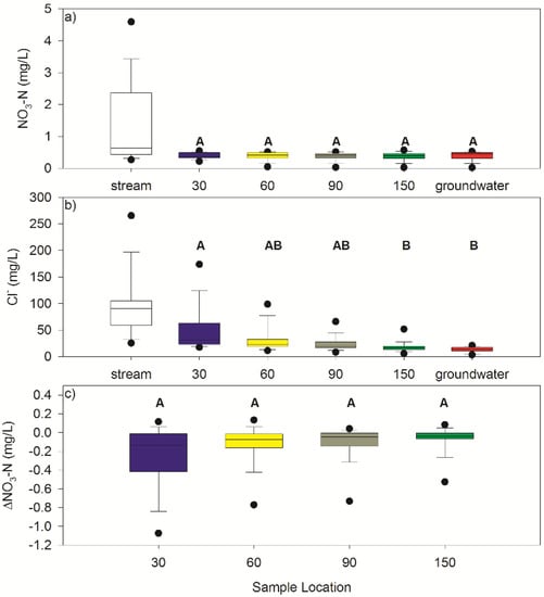 Box and whisker plots for (a) NO3-N concentrations, (b) Cl− concentrations, and (c) ΔNO3-N values. Letters signify statistically similar means among the sample locations.
