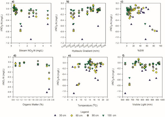 Relationships between ΔNO3-N and (a) stream NO3-N concentration; (b) hydraulic gradient between LK 60 and the stream; (c) %SW; (d) organic matter (OM); (e) temperature measured at a given depth; and (f) measured visible light during the day of sampling.