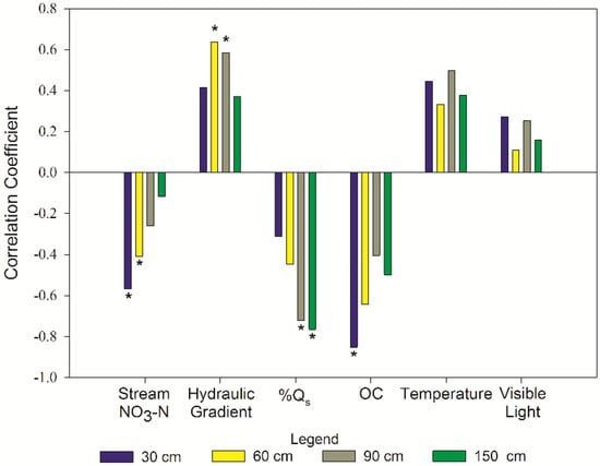 A one-way analysis of variance (ANOVA) (α = 0.05) was used to determine if concentrations in waters at the different depths were statistically similar. Individual t-tests (α = 0.05) were used to assess if the stream water and the groundwater had different concentrations of NO3-N and Cl− to serve as endmembers of the mixing model. Linear relationships between ΔNO3-N and the potential controlling variables—stream NO3-N concentration, hydraulic gradient, OM, water temperature, and visible light—were determined examining the Pearson correlation coefficient and subsequently assigned a classification [].